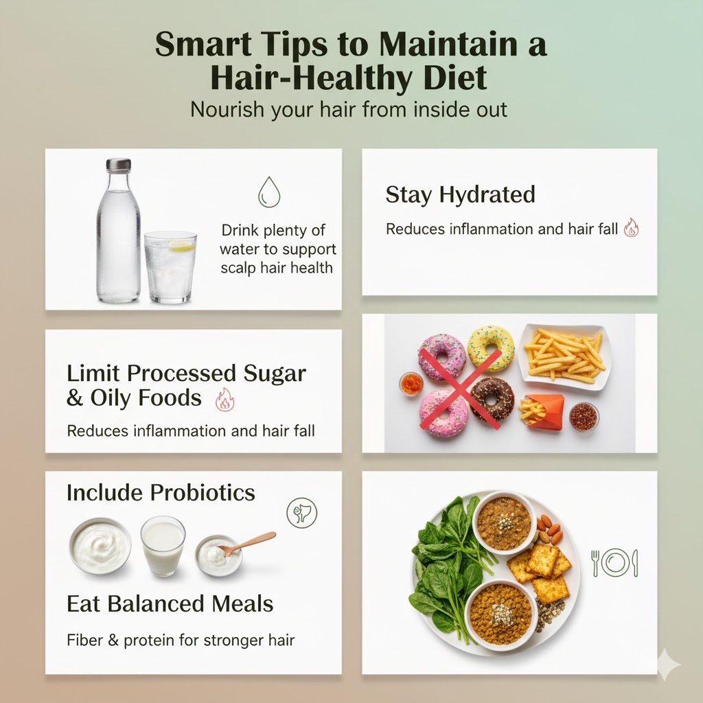 - Limit processed sugar and oily foods: Reduces inflammation and hair fall.