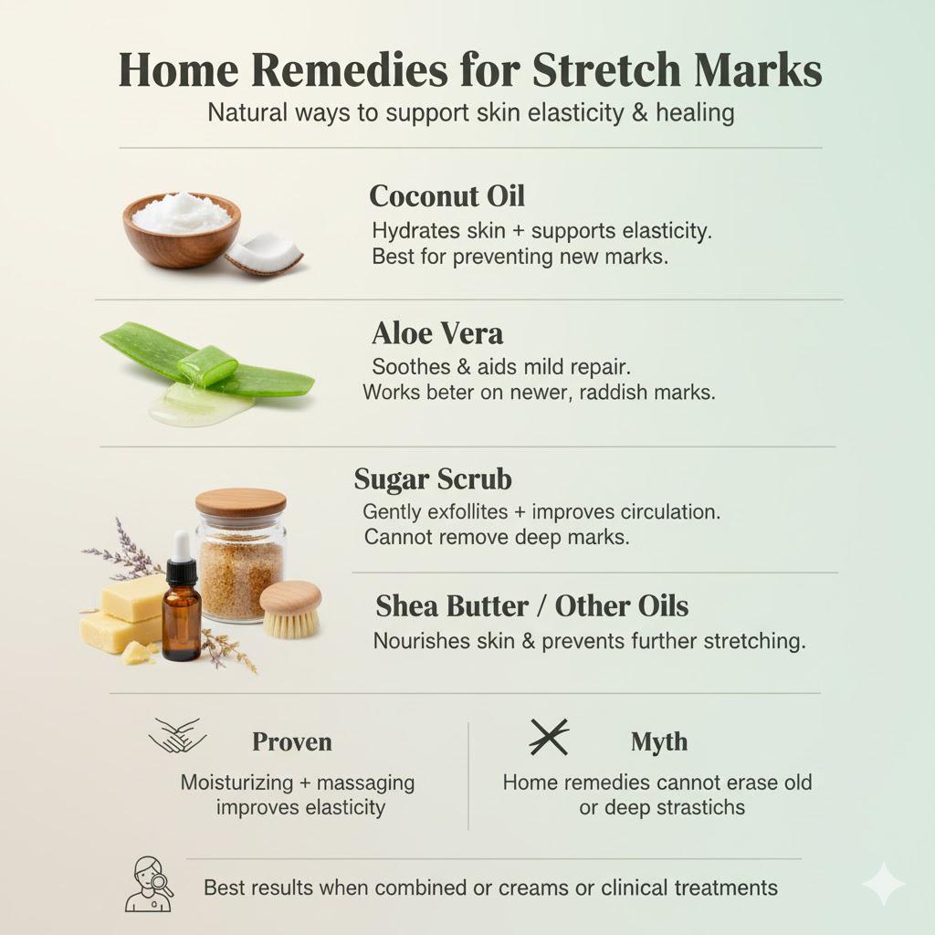- Myth: No home remedy can completely erase deep or old stretch marks. Natural remedies are most effective for prevention and lightening newer marks, rather than permanent removal.