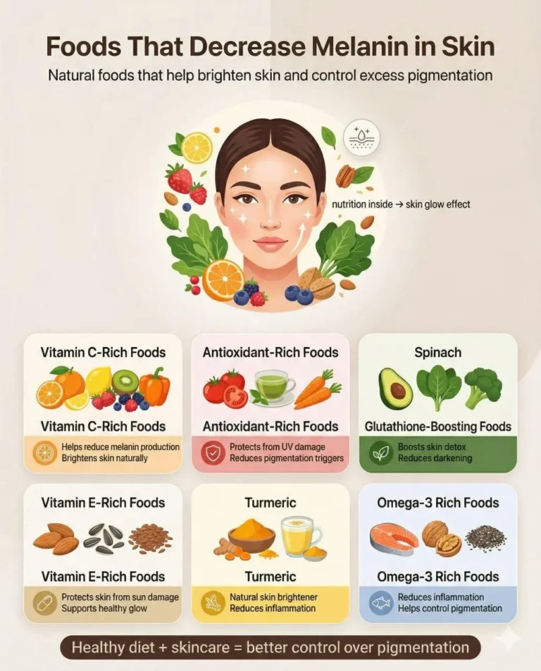 You cannot fully reduce melanin in just 7 days, as it is a gradual process. However, eating Vitamin C-rich foods, drinking enough water, and applying sunscreen daily can show early signs of improvement. Consistency over weeks and months gives real results.